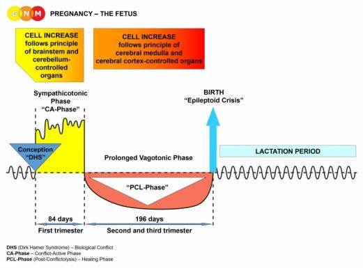 ![]() Similar to a Biological Special Program that is initiated by a biological conflict, the pregnancy – the period from conception to birth – progresses in two phases: a sympathicotonic phase followed by a vagotonic phase. The moment of conception is equivalent to a DHS.
