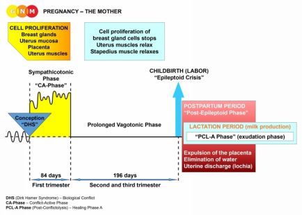 When a pregnant woman suffers a biological conflict during the first trimester (sympathicotonic phase), the corresponding organ generates cell proliferation or cell loss, depending on the nature of the conflict. At the beginning of the fourth month of pregnancy (vagotonic phase), the changes on the organ level stop. The conflict is not resolved, only postponed! If the conflict has not been resolved by the time of delivery, the cell increase or cellular depletion on the affected organ continues with the onset of labor (“Epileptoid Crisis”). A reactivation of a conflict or of several conflicts can create a postpartum depression or postpartum psychosis.