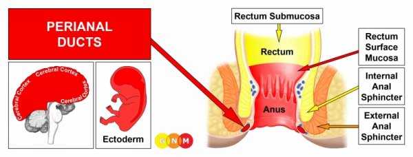 DEVELOPMENT AND FUNCTION OF THE PERIANAL DUCTS: The perianal ducts carry fluid produced in the anal glands into the rectum to aid defecation. The glands themselves are located on either side of the anus between the internal and external anal sphincter. In mammals, these glands are referred to as “scent glands” because they enable the animals to mark their territory (in addition to feces and urine) and to identify members within a species. The lining of the perianal ducts consists of squamous epithelium, originates from the ectoderm and is therefore controlled from the cerebral cortex.