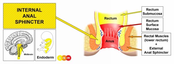 DEVELOPMENT AND FUNCTION OF THE INTERNAL ANAL SPHINCTER: The internal and external anal sphincters control the closing of the anus and the elimination of feces. The internal anal sphincter is a muscular ring that surrounds the anal canal. It is formed by a thickening of the circular muscles of the rectum. The internal anal sphincter consists of smooth muscles, originates from the endoderm, and is controlled from the midbrain.