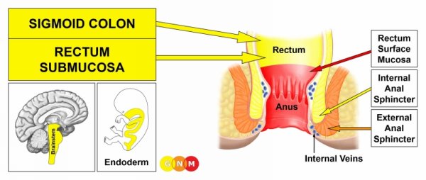 DEVELOPMENT AND FUNCTION OF THE SIGMOID COLON AND RECTUM SUBMUCOSA: The sigmoid colon is the final portion of the large intestine joining the rectum. The rectum connects with the anus, the opening where waste matter in form of stool passes out of the body. To facilitate the expulsion of fecal matter, the anal sphincters relax to allow feces to exit the intestinal canal. The sigmoid colon and rectal submucosa consist of intestinal cylinder epithelium, originate from the endoderm and are therefore controlled from the brainstem.