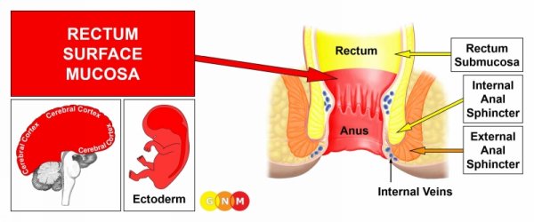 DEVELOPMENT AND FUNCTION OF THE RECTUM SURFACE MUCOSA: The rectal surface mucosa covers about 12 cm of the endodermal submucosa in the lower section of the rectum. The surface mucosa consists of squamous epithelium, originates from the ectoderm and is therefore controlled from the cerebral cortex. The inner wall of the lower rectum is endowed with striated muscles.