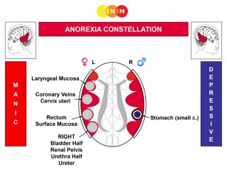 Anorexia (anorexia nervosa) presents as compulsive fasting and a refusal to eat. Anorexics might weigh themselves several times a day. The fear of gaining weight is the main conflict track. A prolonged Anorexia Constellation causes extreme weight loss and can, therefore, be life-threatening.