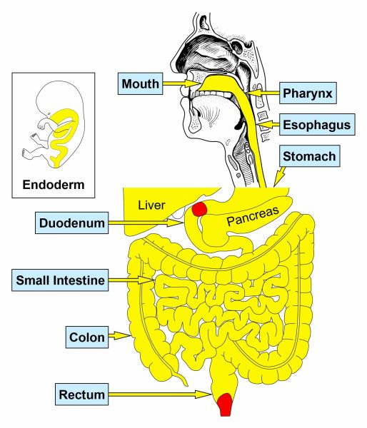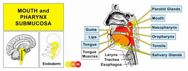 DEVELOPMENT AND FUNCTION OF THE MOUTH AND PHARYNX SUBMUCOSA: The mouth is the opening of the alimentary canal and the place where the digestion (secretory quality) and absorption (absorptive quality) of food starts. The tongue is an accessory digestive organ that aids in chewing and swallowing. Through chewing, food is broken into small pieces. Saliva produced in the salivary glands moistens the food bolus to make swallowing easier. The salivary glands are located in several parts of the mouth. The largest salivary glands are the parotid glands in front of the ears, the sublingual glands underneath the tongue, and the submandibular glands beneath the lower jaw. The pharynx connects the mouth and nasal cavities with the trachea and the larynx. The nasopharynx, located in the back of the nose, extends to the upper surface of the palate which forms the roof of the mouth; the oropharynx is at the very back of the mouth. On both sides of the pharynx lie the tonsils. Branching off the pharynx is the esophagus that carries food from the mouth to the stomach. The submucosa of the mouth and pharynx (including the lips, gums, palate, tongue, salivary glands, tonsils, and throat) consists of intestinal cylinder epithelium, originates from the endoderm and is therefore controlled from the brainstem.