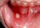 In the mouth, the healing phase presents as canker sores (aphthous ulcers) on the inside of the lips or cheeks, on the palate or tongue, or in all areas of the mouth, depending on the perception of the conflict situation (compare with aphthous ulcers related to the mouth surface mucosa). Canker sores appear as round or oval white spots with an inflamed border. They can be quite painful. On the gums, the pus-filled pocket is called a “dental abscess” or gum abscess. The tuberculous discharge causes bad breath.