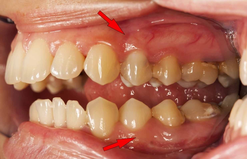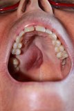 BIOLOGICAL CONFLICT OF THE MOUTH SURFACE MUCOSA: The biological conflict linked to the mouth surface mucosa (including the lips, gums, palate, and tongue) is an oral conflict of either “not being able to take something into the mouth” or, the opposite, of “not being able to get rid of something that is in the mouth or on the tongue”. In both cases, this concerns food one desires but is unable or not allowed to “take in” (being on a restricted diet, e.g., diabetics) or food one wants to “spit out”. Regarding the latter, this differs distinctively from the conflict of “not being able to eliminate a morsel” linked to the left half of the mouth submucosa. While the deep endodermal layer of the mouth correlates biologically to the actual morsel (real or figurative) one wants to expel, the upper ectodermal layer is rather about contact with the “morsel”, namely, wanting to separate from what is in the mouth (see separation conflict related to the epidermis). Conversely, the conflict of not being able to get something desirable into the mouth can be triggered by having to refrain from cigarette smoking or alcohol. A lip-related conflict translates into the loss of physical contact or the fear of losing contact associated with the lips, for example, if one is no longer able or allowed to kiss a person or a pet. Equally, it also applies to not wanting to be kissed or having tongue or lip contact. This includes contact with objects such as a drinking glass, a straw, eating utensils, dental tools, and the like. In a figurative sense, the oral conflict translates into not being allowed or able to say something that is “on the tip of the tongue”.