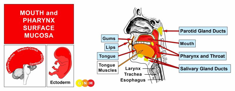 DEVELOPMENT AND FUNCTION OF THE MOUTH AND PHARYNX SURFACE MUCOSA: The submucosa of the mouth and pharynx is covered with a cell layer composed of squamous epithelium, which derives from the ectoderm and is therefore controlled from the cerebral cortex. NOTE: The tonsils do not have an ectodermal surface mucosa.