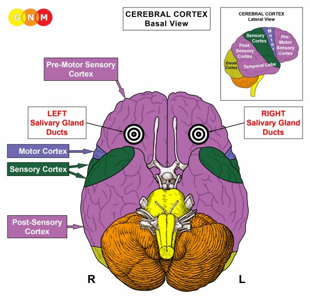 CONFLICT-ACTIVE PHASE: Starting with the DHS, during the conflict-active phase cells in the submucosa of the mouth or pharynx proliferate proportionally to the intensity of the conflict. The biological purpose of the additional cells is to better insalivate a morsel in order to absorb (right half) or expel (left half) it faster. Salivation is stimulated by the autonomic nervous system. This is why the secretion of saliva increases with the smell of “mouth-watering” food. In the English language, “salivating” and “drooling” are synonyms for “craving” for something or someone desirable.