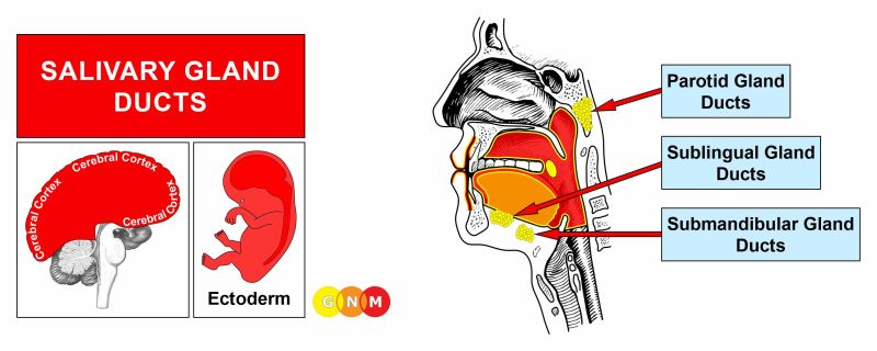 DEVELOPMENT AND FUNCTION OF THE SALIVARY GLAND DUCTS: Saliva, produced in the salivary glands (sublingual glands, submandibular glands, parotid glands) reaches the oral cavity through the salivary gland ducts. The moisturizing function of saliva allows to insalivate the “food morsel” so that it can pass easily from the mouth into the esophagus. The lining of the salivary gland ducts consists of squamous epithelium, originates from the ectoderm and is therefore controlled from the cerebral cortex.