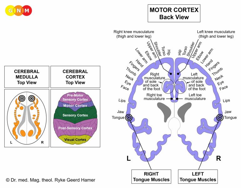 CONFLICT-ACTIVE PHASE: cell loss (necrosis) of tongue muscle tissue (controlled from the cerebral medulla) and, proportional to the degree of conflict activity, increasing paralysis of the tongue muscles (controlled from the motor cortex) affecting speech and swallowing (see also stroke and tongue paralysis). Whether the right or left side of the tongue is affected is determined by a person’s handedness and whether the conflict is mother/child or partner-related.