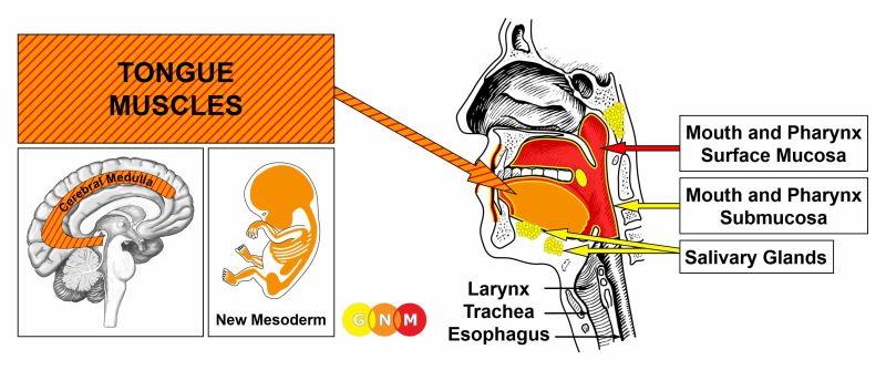 DEVELOPMENT AND FUNCTION OF THE TONGUE MUSCLES: The tongue is a muscular organ covered by an endodermal submucosa and an ectodermal surface mucosa. The tongue coats food with saliva, aids in chewing and pushing food into the pharynx from where it goes through the esophagus into the gastrointestinal tract. Next to chewing and swallowing, the tongue assists in speech and the formation of words. The tongue consists of striated muscles, originates from the new mesoderm and is therefore controlled from the cerebral medulla and the motor cortex.